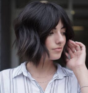 A take on a classic shag, this short bob plays up all the texture with layers and thick curtain bangs.